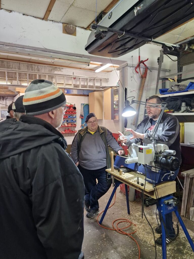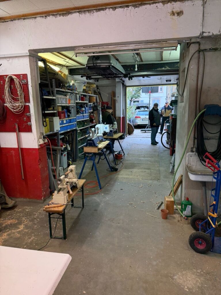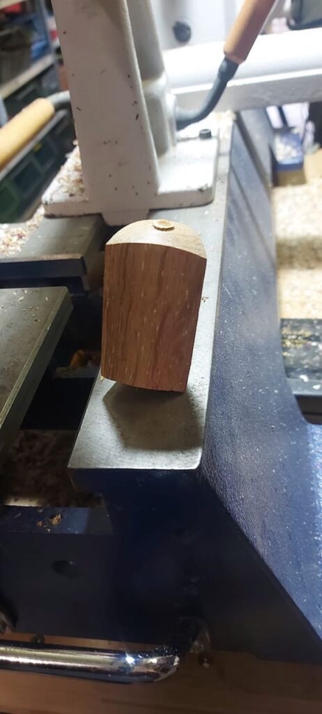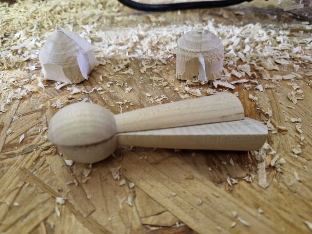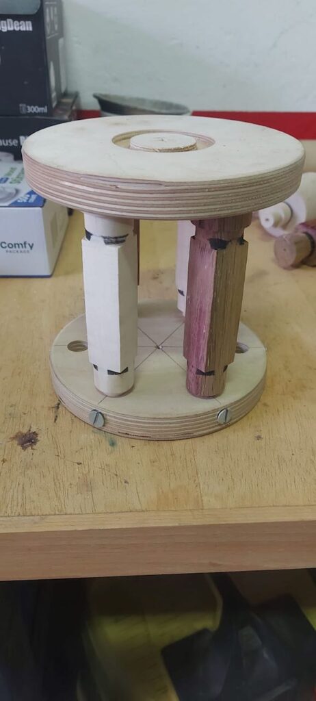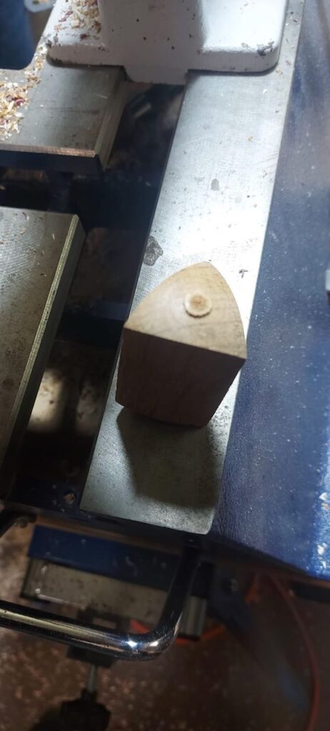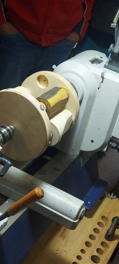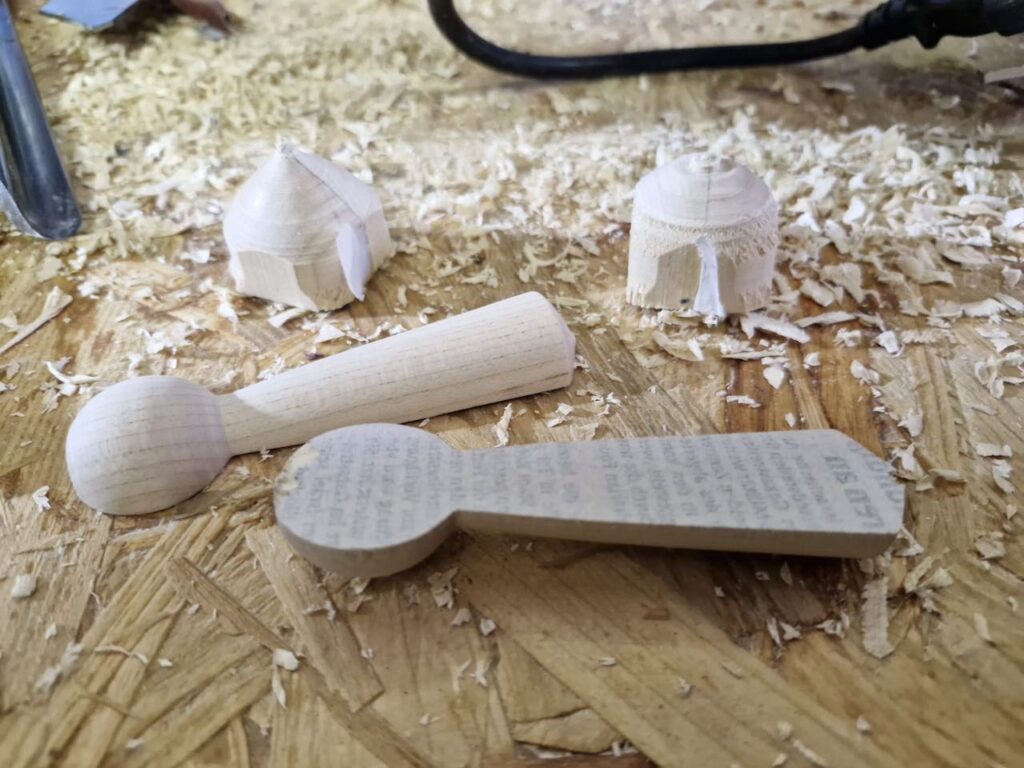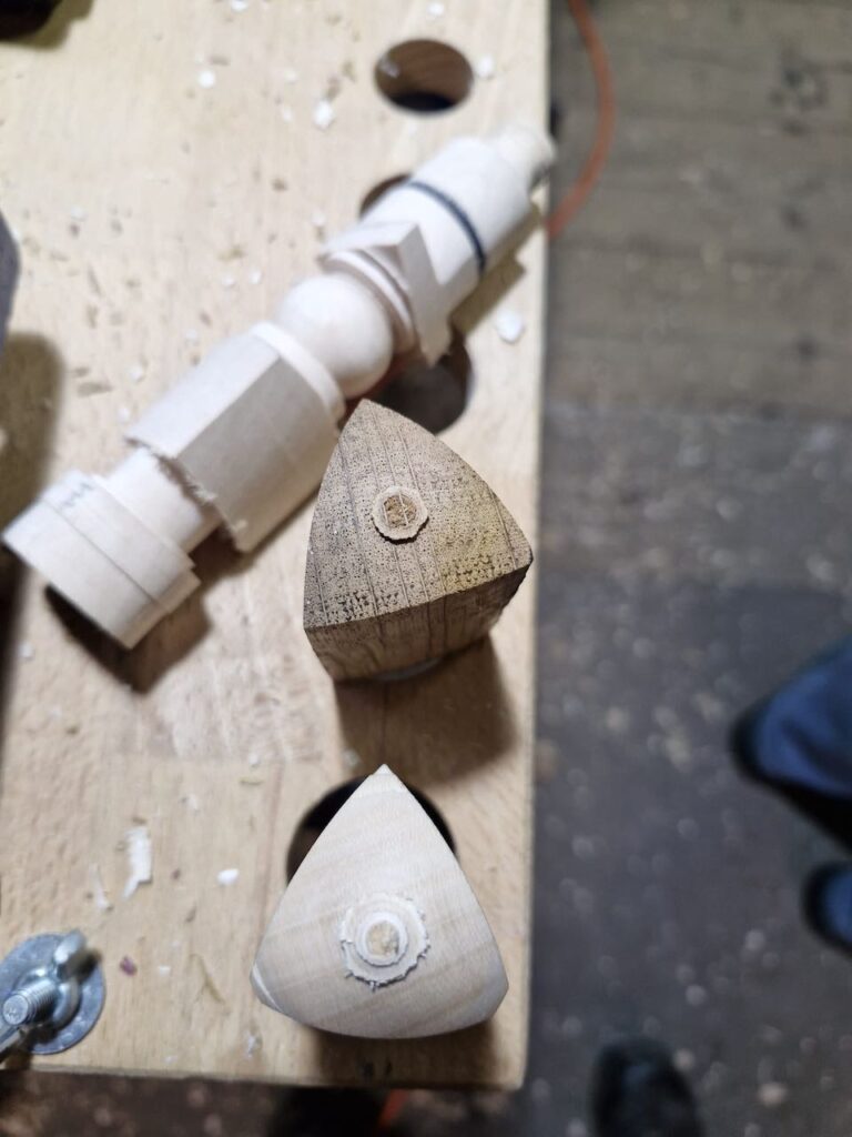 Ich hatte für diesen Tag ein paar Vorbereitungen getroffen und hier ausführlich beschrieben. Ich hab dann an dem Tag quasi alles mündlich erklärt, was ich in meinem Abenteuer Trommel Drechseln gelernt hatte und dabei auch den ein oder anderen zum Lachen gebracht. Als Vorführung hatte ich dann die dreieckigen Figuren gedrechselt und wollte ein wenig mit der Form zwischen den Spitzen spielen. Also den Boden der Figur plan, aber oben Konvex oder Konkav? Vielleicht ein Zierring in der Mitte, der am Ende aber nicht schön wurde und eventuell besser in der Trommel schon angedreht werden muss… Dann hab ich festgestellt, dass man die Bleistiftmarkierungen auf der Eiche weniger gut erkennt und somit dann keine dreieckige Form erhalten… Und was eben alles so schief gehen kann.