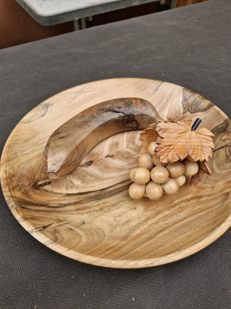 Auf dem Tisch für die Ausstellung stand diesmal nicht so viel. Klaus-Peter hatte hier einen wunderschönen Teller mit einer geschnitzten Banane und einer geschnitzten Traube mit Weinblatt hin gelegt. Ich vermute danach hatte sich niemand mehr getraut!