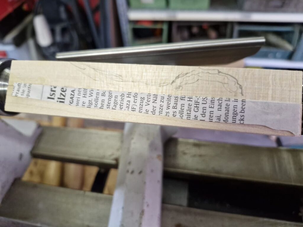 Parallel hat der Klaus-Peter sich noch an der Papierverleimung versucht. Also zwei Holzstücke mit einem Papier verleimt, an dem die Teile später leicht aufgetrennt werden können. Gedrechselt werden dann beide Stück zusammen auf der geleimten Achse und es entstehen zwei identische Werkstücke nach dem Trennen entlang der Leimfuge. Die Einzelteile sind dann quasi Exzentrisch gedreht. Mithilfe von Opferholz zwischen den Verleimungen kann man hier auch größere Achsabweichungen erreichen.