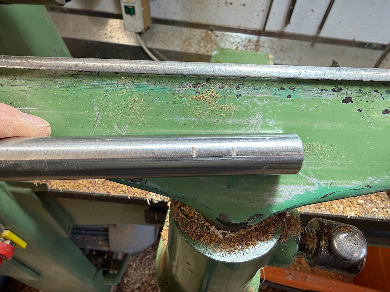 Bei meiner Letzten Metall Bestellung fügte ich dann einen 18mm Edelstahl Rundstahl hinzu mit 50cm Länge. Das passt sehr gut um die Werkzeuge aus der Spindel auszuschlagen. Hier hab ich dann die Kanten am Schleifbock leicht verrundet und ein paar kleine Kerben rein geschliffen, damit der Griff besser hält.