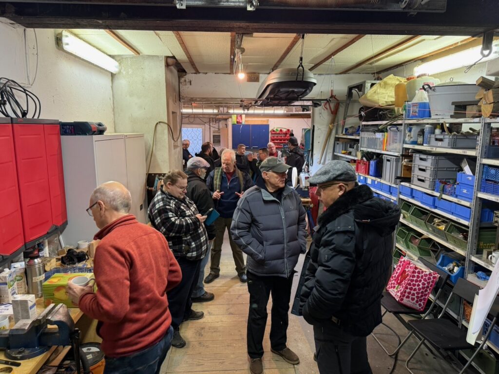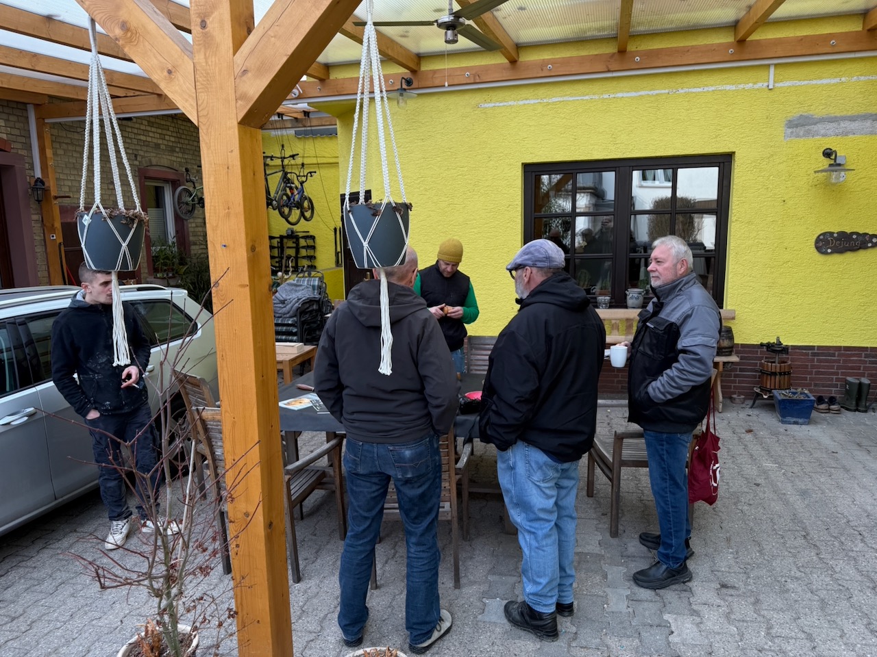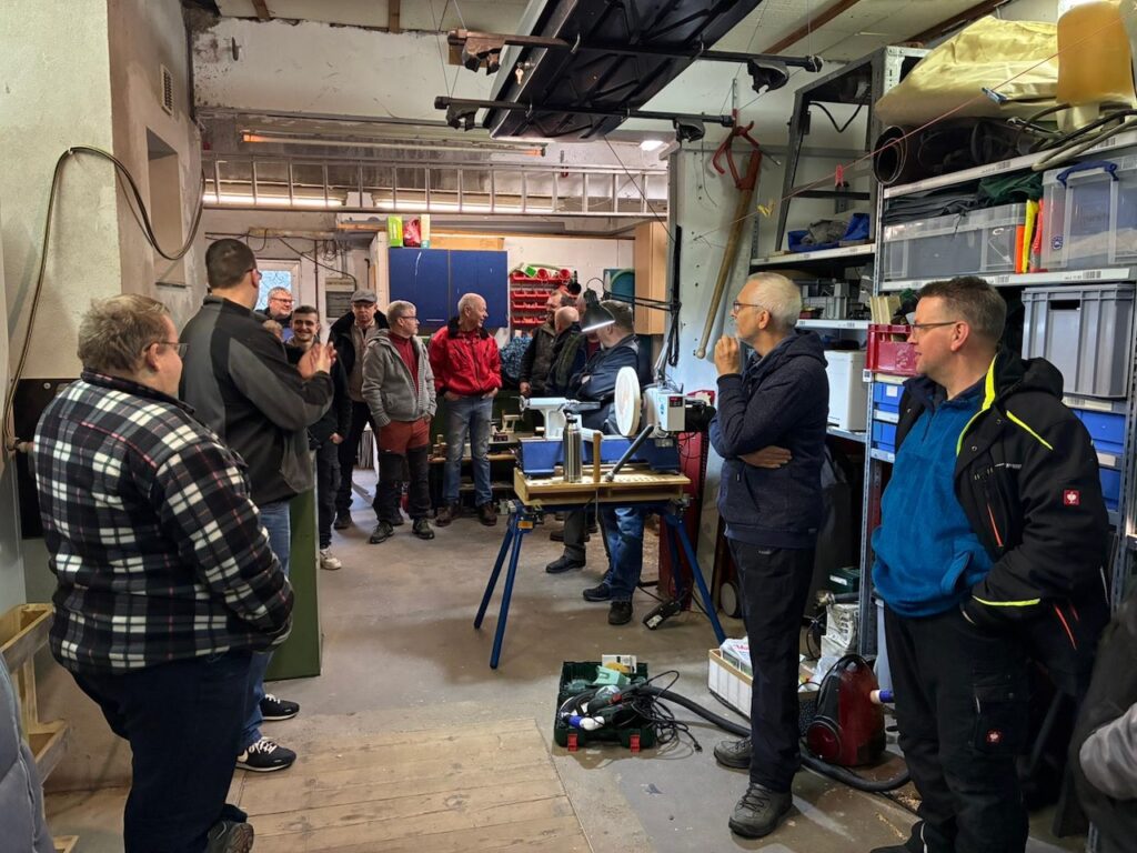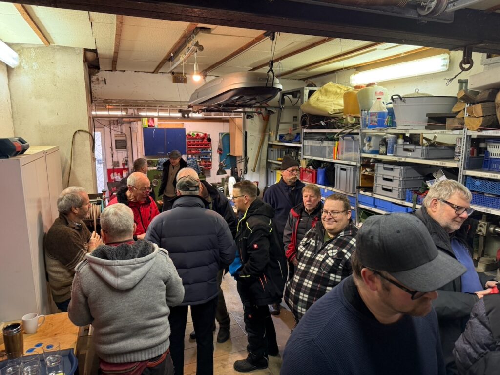 Ansonsten war es sehr gesellig. Wir hatten einige neue Gesichter dabei, die auf verschiedenen Wegen zu uns gefunden hatten. Alle schienen sich recht wohl zu fühlen und keiner musste frieren, dank der kurz vorher getesteten Heizung. Es haben sich einige Gespräche entwickelt, sei es an einer der Drechselbänke, nahe der Kaffeemaschine oder auch draußen an unserem Gabentisch.