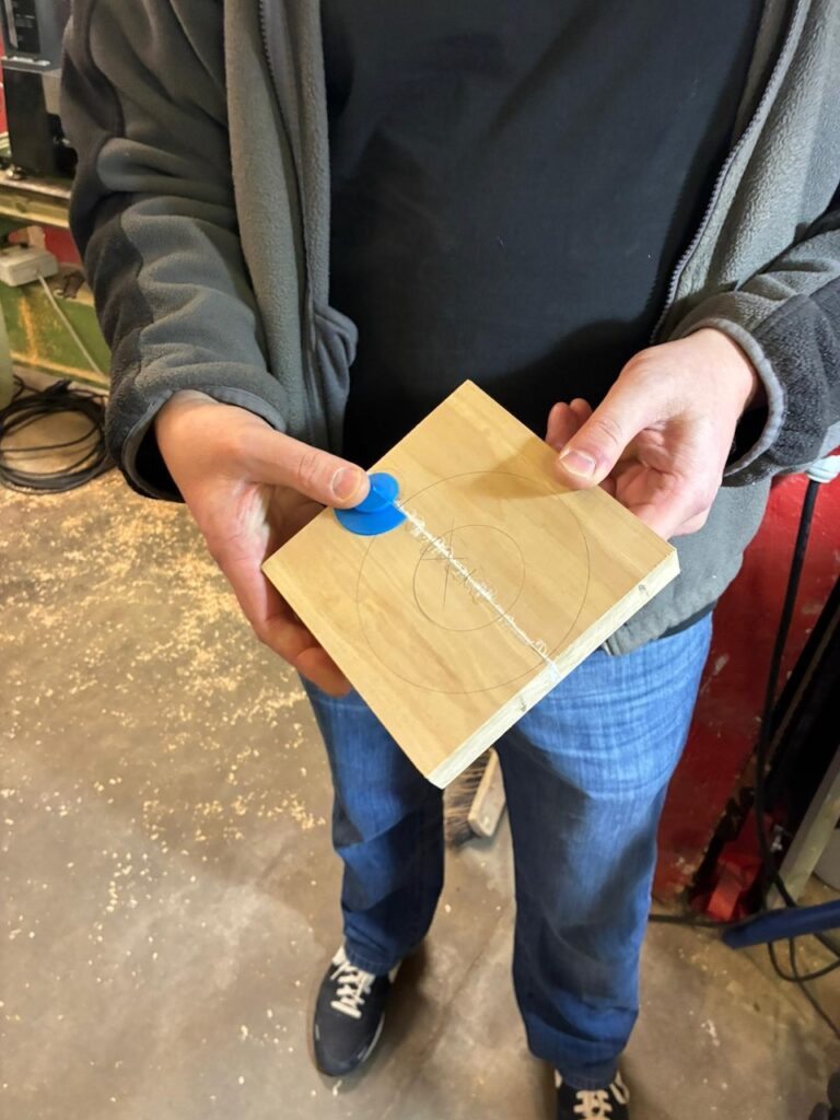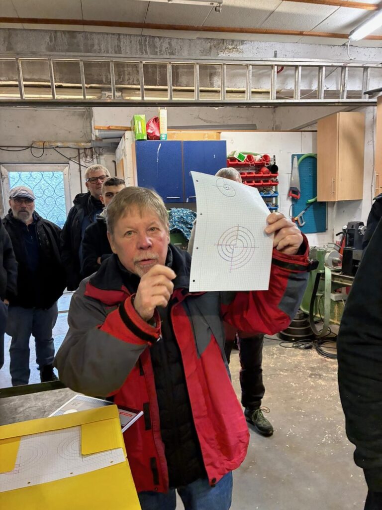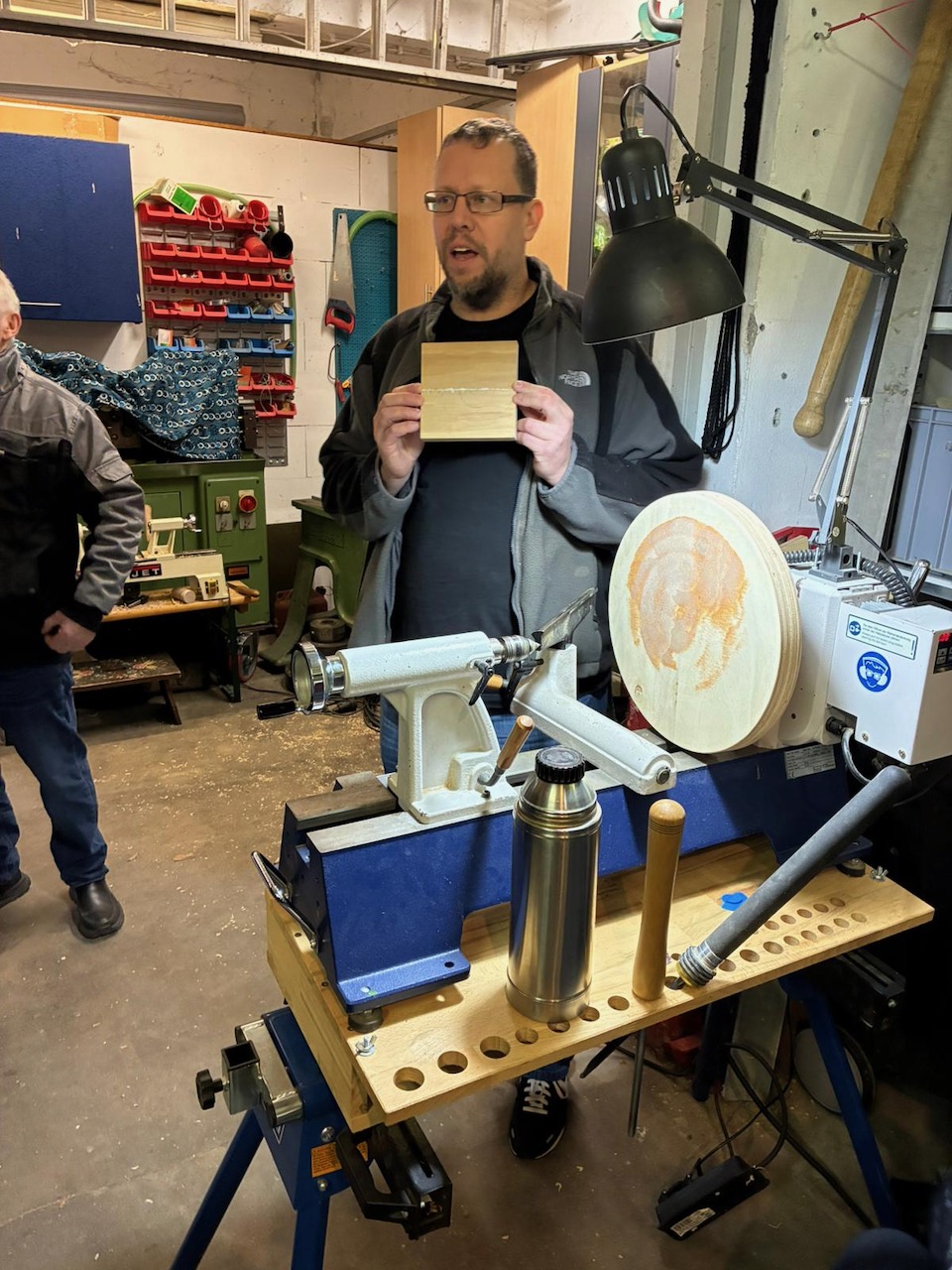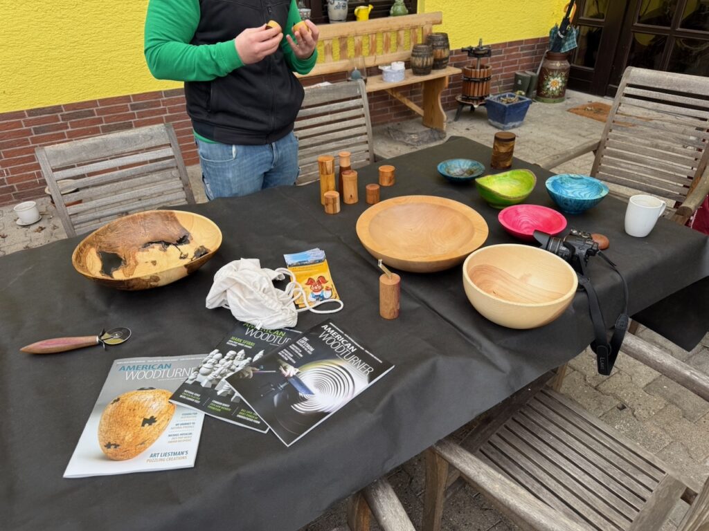 Ansonsten war es sehr gesellig. Wir hatten einige neue Gesichter dabei, die auf verschiedenen Wegen zu uns gefunden hatten. Alle schienen sich recht wohl zu fühlen und keiner musste frieren, dank der kurz vorher getesteten Heizung. Es haben sich einige Gespräche entwickelt, sei es an einer der Drechselbänke, nahe der Kaffeemaschine oder auch draußen an unserem Gabentisch.