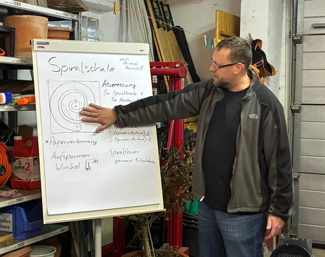 Richtig gefreut hatte mich die Rückmeldung von Frieder S. aus T., der sich zusammen mit Johannes K. aus T. Gedanken gemacht hatte, wie man die Spirale mehr Spiralförmig bekommen könnte und vielleicht weitere Variationen. Leider war Johannes krank und konnte nicht kommen um seine Lösungen zu zeigen. Frieder hatte dann ein paar Zeichnungen vorgestellt und erklärt.