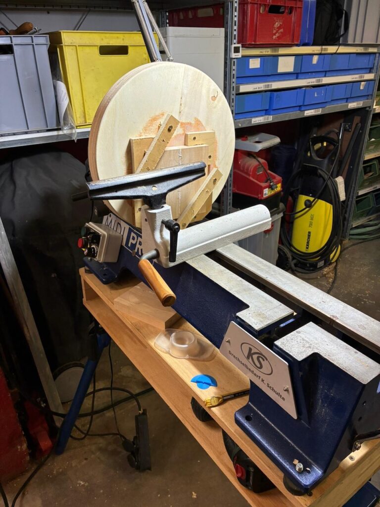 An der Bank musste ich dann schnell noch ein paar Anpassungen an meiner Spanntechnik vornehmen, da sie für die kleinere Spitzenhöhe nicht wirklich geeignet waren. Ich hoffe ich bekommen hier noch ein paar Bilder von den Kollegen, aber auch hier war ich mit dem Ergebnis einigermaßen zufrieden und es bedarf noch etwas mehr Nach- und Schleifarbeit, geschuldet der geringen Drehzahl und meiner Ungeduld.