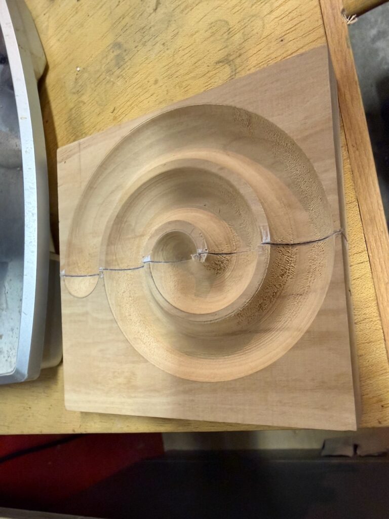 Ebenfalls hat mich ein Ergebnis von Klaus-Peter S. aus F. gefreut, der auch eine Spiralschale hergestellt hatte, aber zu einer anderen Lösung als ich gekommen bin. Er hatte alles komplett im Spannfutter gespannt und sein Ergebnis steht meinem um nichts nach. Leider hab ich hier ein Foto vergessen 🙁