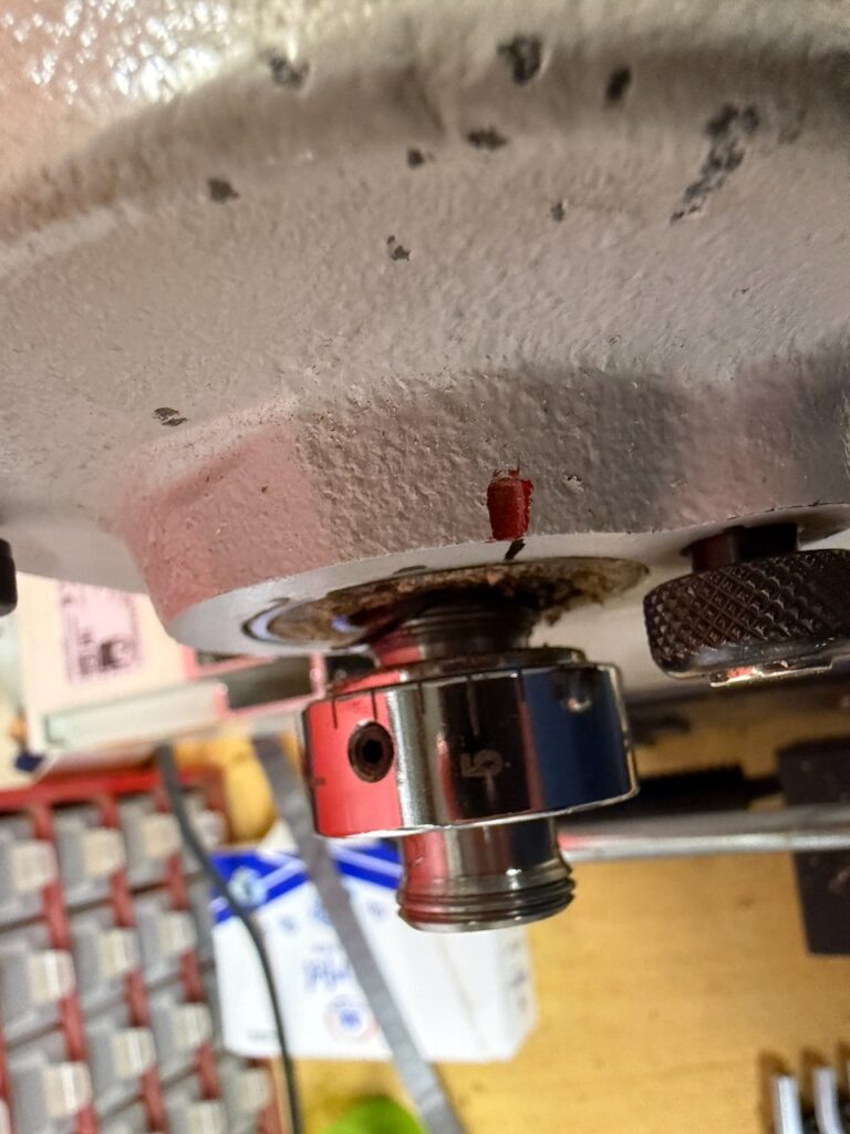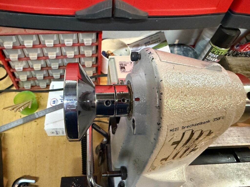 Danach blieb nur noch den Federring aufstecken, die Sicherungsmutter und Handrad aufzuschrauben, alle Madenschrauben anziehen und die vier Schreiben vom Drehzahlmesser eindrehen.