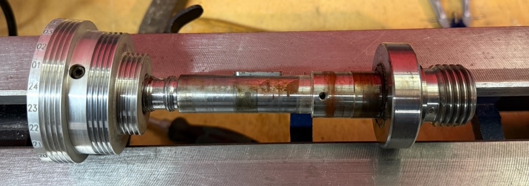 Da wir hier aber nicht mit dem Hammer arbeiten wollen, dies würde die Lager beschädigen, habe ich die Welle mit einer M10 Gewindestange eingebaut. Hierzu hab ich mir aus einem Reststück Holz ein Druckring gedrechselt, der auf den inneren Lagerring des hinteren Lagers drückt. Er hat eine Länge von rund 50mm, damit der Spindelteil vom Handrad komplett in den Druckring passt.
