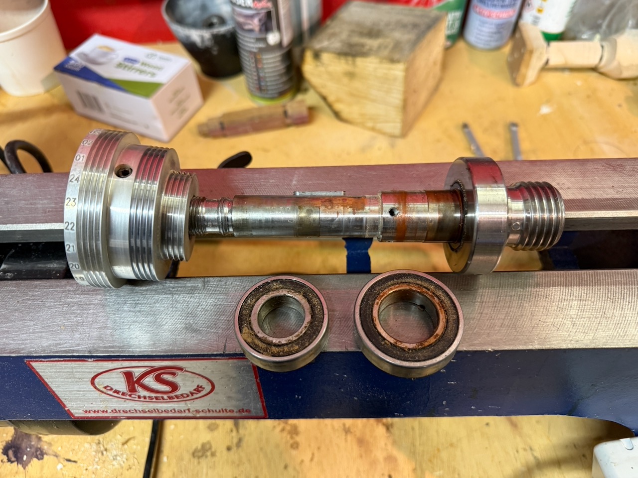 Kurz drauf lagen die Spindel, Lager und Riemenscheibe auf der Bank… Neue Lager bestellt, zwei Rillenkugellager von SKF 6004 und 6005, jeweils mit 2RSH, also abgedichtet. Innerhalb von zwei Tagen waren die Lager da. Ich hab alle Lagersitze sowie die Spindel gereinigt. Die Lager dann mit einem Stück Holz und nem Hammer in die Lagersitze geklopft und mich dann um die Spindel gekümmert. Hier ist es wichtig darauf zu achten, dass beim Wiedereinbau die Riemenscheibe an der richtigen Stelle sitzt und man den Keilriemen nicht vergisst 😉