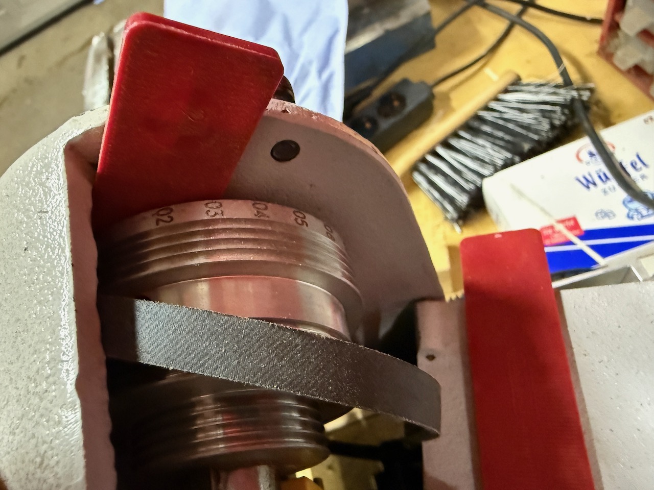 - Danach mit etwas Holz die Riemenscheibe einklemmen, damit sie beim Spindelaustreiben nicht gegen den Drehzahlsensor stößt